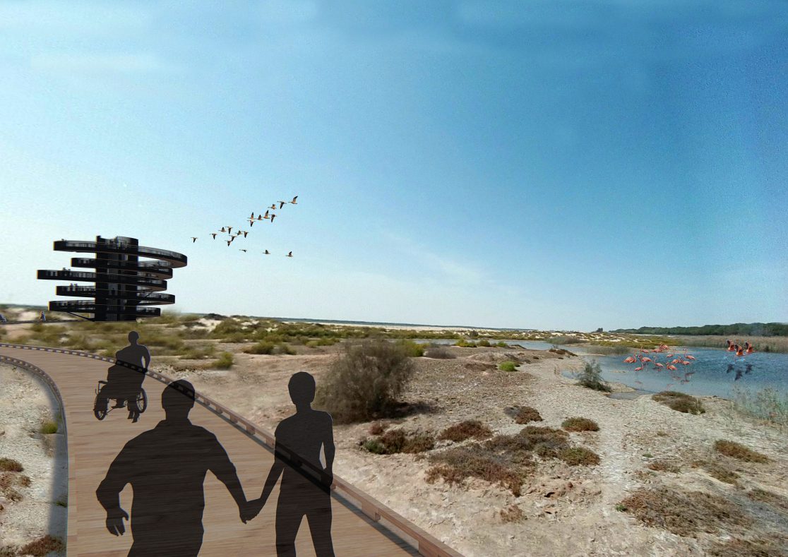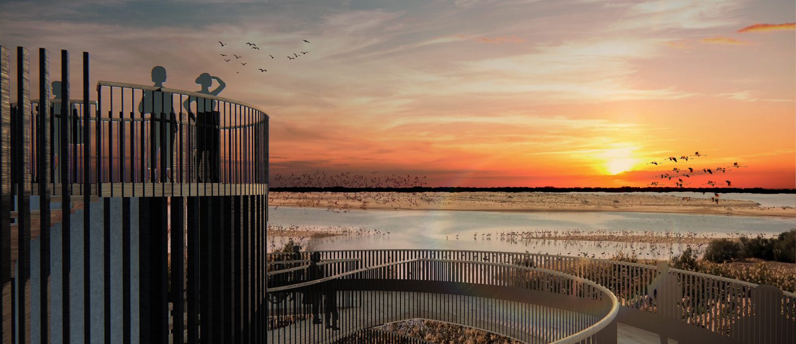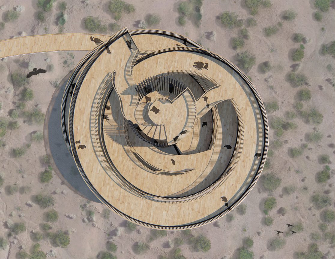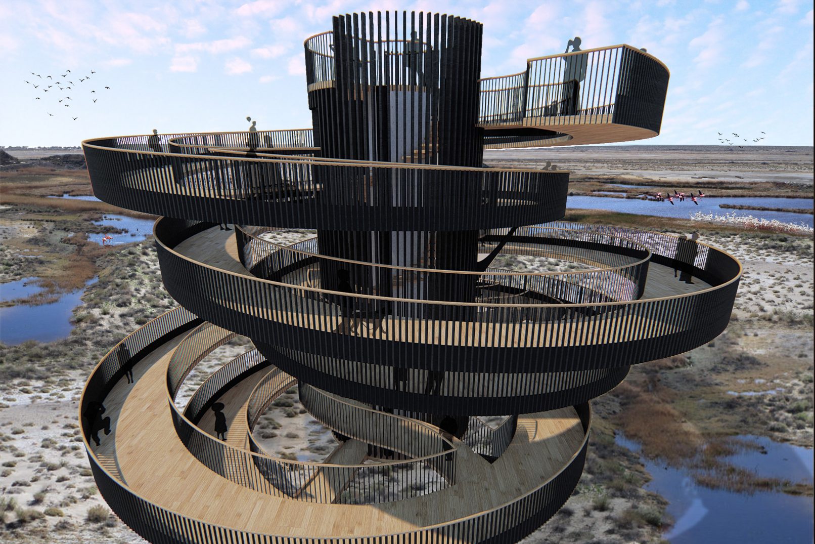 Calling for a new observation tower that would allow visitors to the Al Wathba Wetland Reserves to view the migratory birds from afar, the brief for this competition spelled out strict guidelines to achieve a sustainable solution that would also be accessible to wheelchair users and other visitors with limited mobility. The proposal submitted by the team mimics the flamingo’s form, taking inspiration from the most populous species of migratory birds and the main draw of the Reserve. With three repeated forms of the accessible pathway revolving around a single spiral stair core, the proposal provides three main viewing platforms to allow visitors to observe the birds across a large expense of the wetlands.