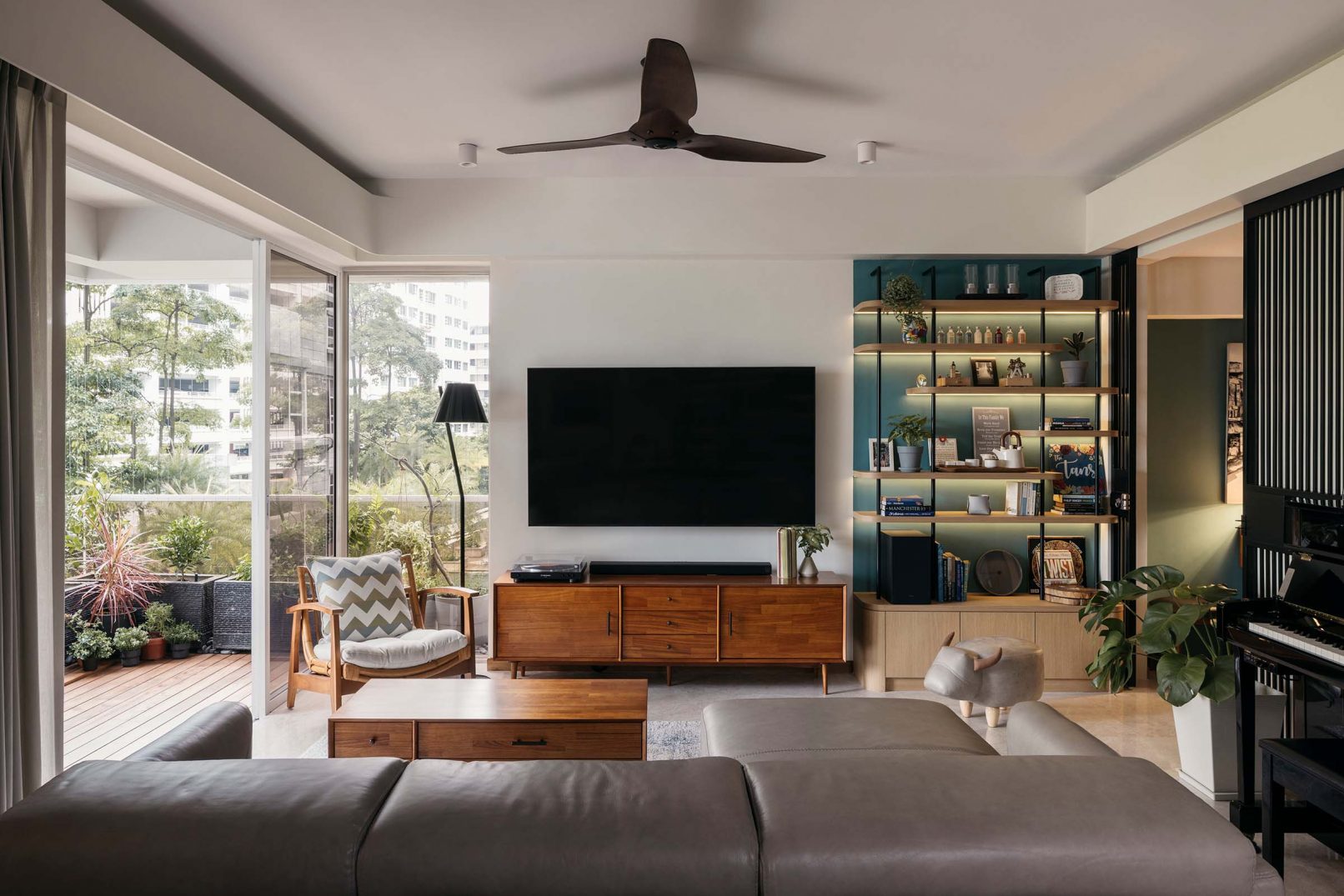 Our design for this home doesn’t compromise security, beauty, and efficiency. With an intent to apply the principles of passive cooling in a Singapore flat. A bespoke security door allows light and air to pass through from the balcony to the private corridor. This creates a welcoming ambience and a bright overall feel inside.