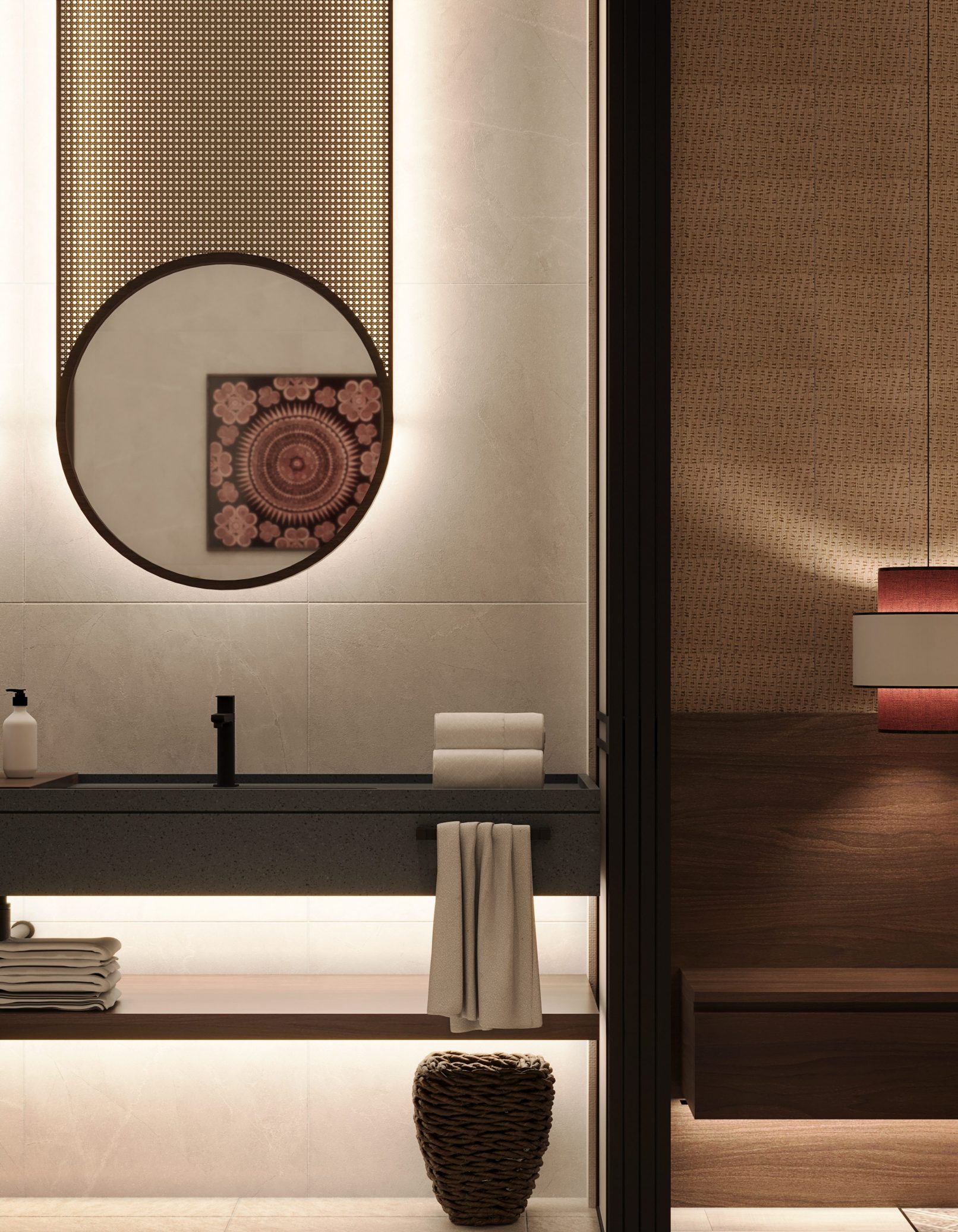The color palette is soft and comfortable, with shades of beige, white, and pops of red to represent the maple trees in the region, and the decor features natural materials like wood, stone and rattan. The guest rooms are fashioned as tranquil oasis, with comfortable furnishings and details taken from the subtle floral motifs from the local tribes.