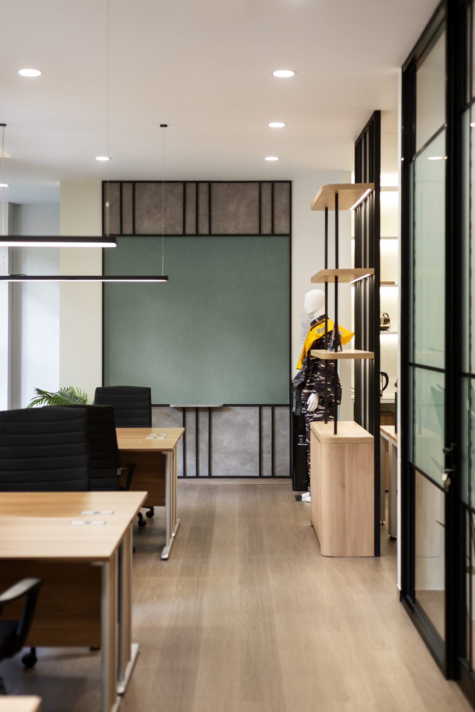 We were commissioned to refresh an existing office in Jakarta, working thoughtfully within the constraints of the inherited layout. Drawing from the building’s exterior rhythm, slim vertical lines and dark frames were introduced to establish a cohesive architectural language throughout. Soft timber tones and muted greens add warmth and calm, while refined detailing balances transparency and privacy across work and meeting spaces. The result is a contemporary workplace that moves away from a conventional corporate feel, offering a crafted environment for focused work and quiet collaboration.