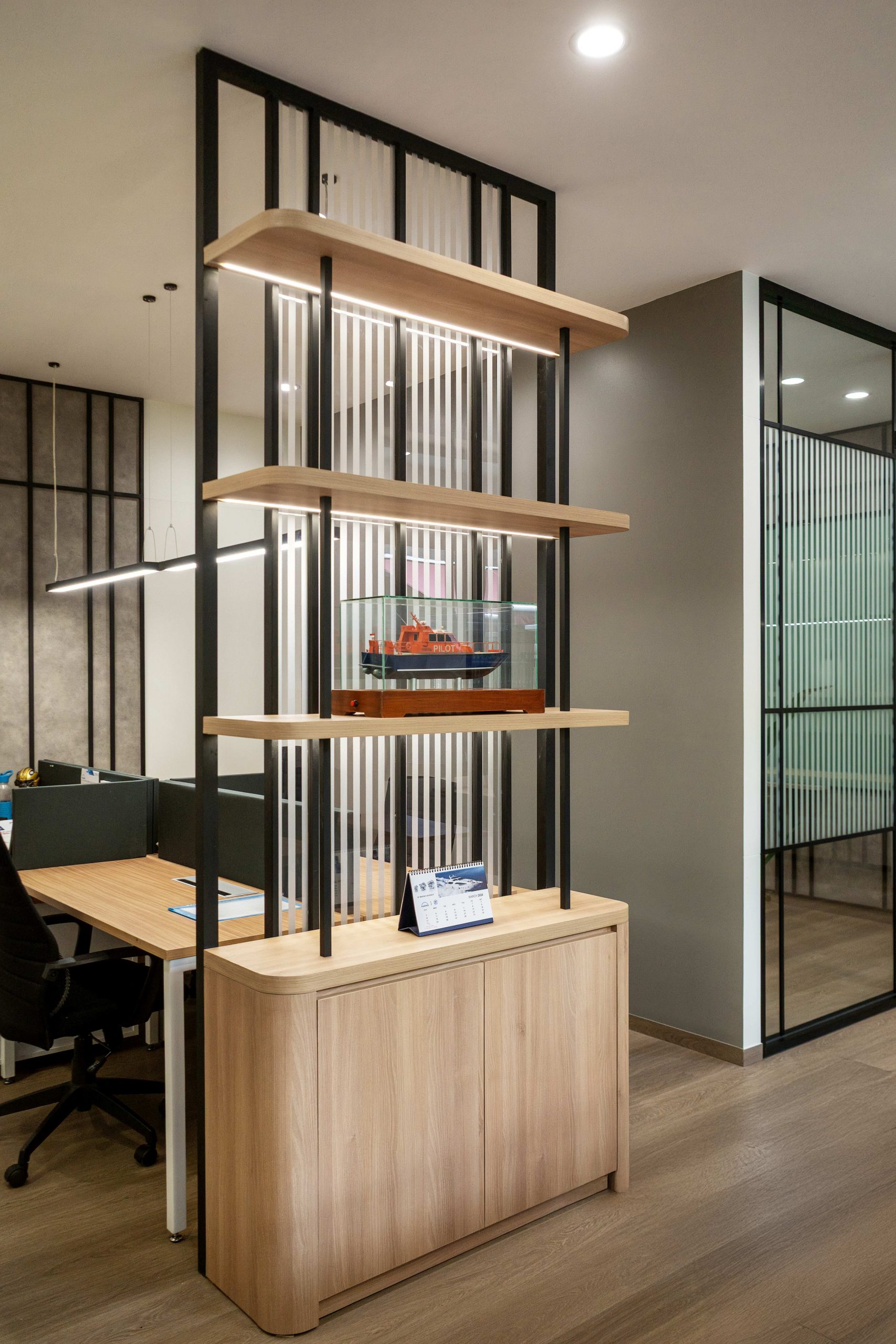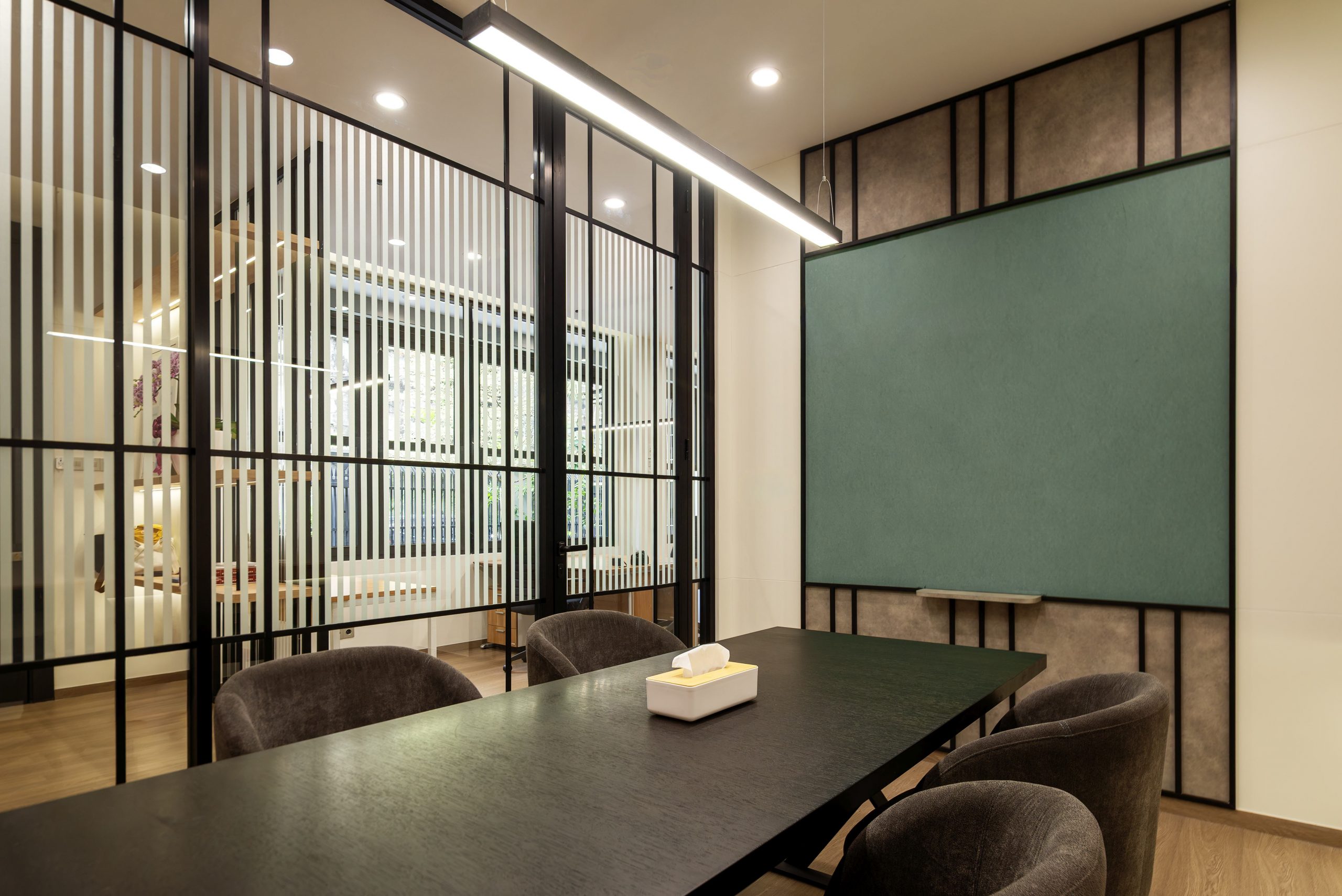 We were commissioned to refresh an existing office in Jakarta, working thoughtfully within the constraints of the inherited layout. Drawing from the building’s exterior rhythm, slim vertical lines and dark frames were introduced to establish a cohesive architectural language throughout. Soft timber tones and muted greens add warmth and calm, while refined detailing balances transparency and privacy across work and meeting spaces. The result is a contemporary workplace that moves away from a conventional corporate feel, offering a crafted environment for focused work and quiet collaboration.